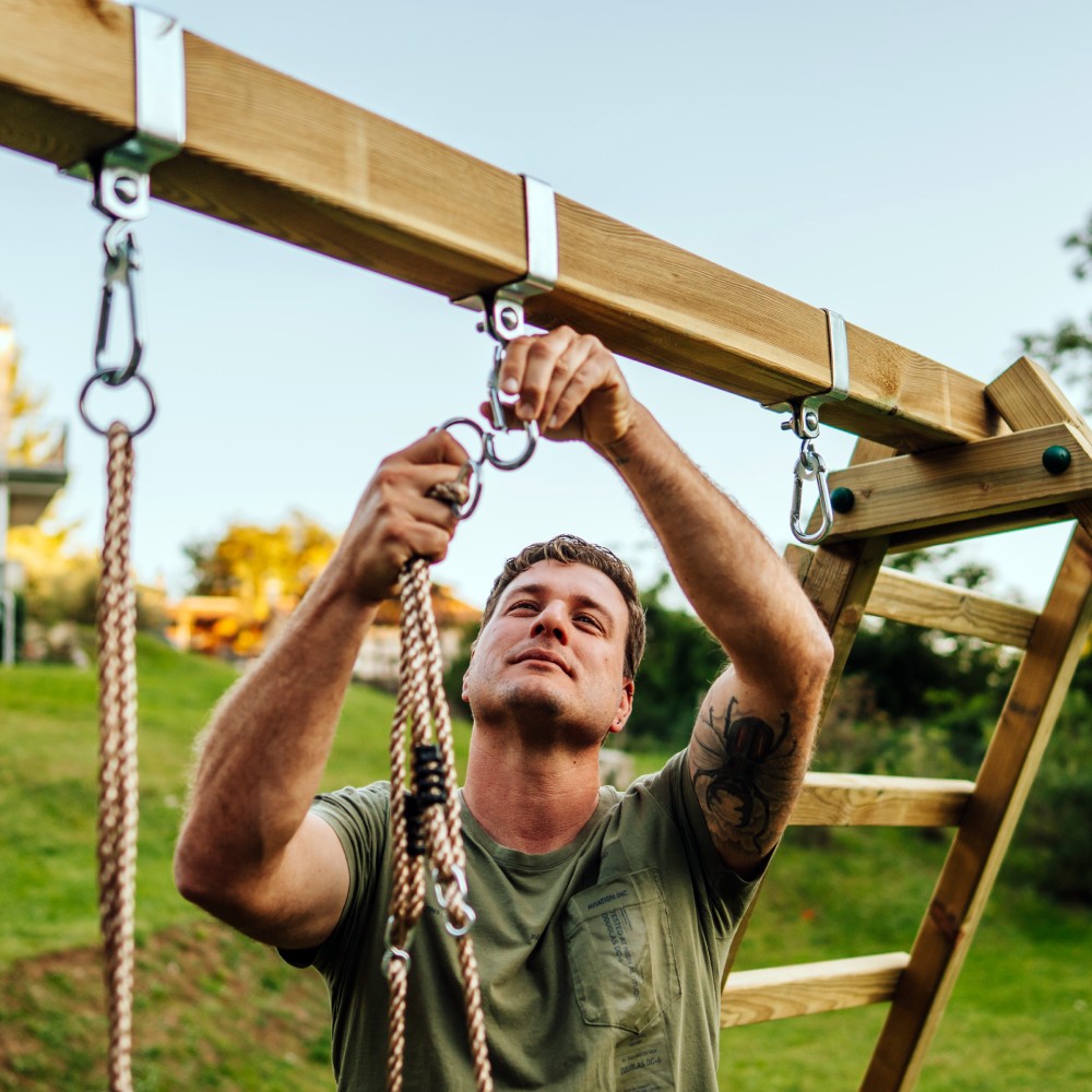 That said, it’s still wise to inspect the structure after assembly, at the beginning of each season, and every two weeks during the season; check the fastening of screws and hooks. Even pressure‑treated wood may show signs of surface wear over many years. Check for cracks, excessive wear at connection points, or splinters, especially after harsh weather or long use. And don’t forget to make sure all hardware (screws, bolts, anchors) remains tight and intact, and replace any worn accessories (swings, ropes, nets).