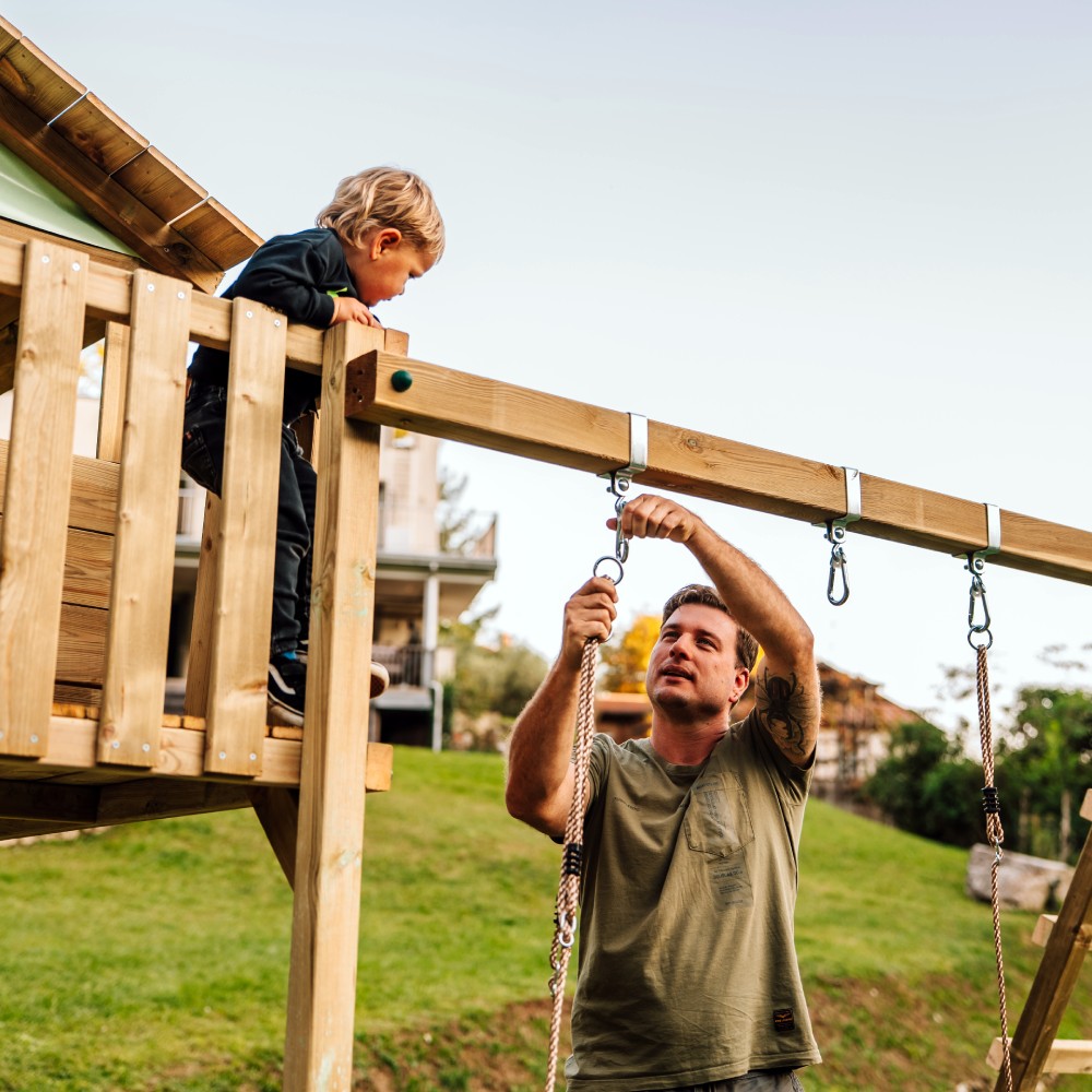 Firstly, it’s important to choose equipment that meets recognized safety standards. Wickey climbing frames are developed according to DIN EN 71-8, the European standard for the safety of toys and playground equipment. This ensures that the materials, design, and construction are safe for children, by choosing features such as sturdy handrails, extra thick beams, and protective caps.